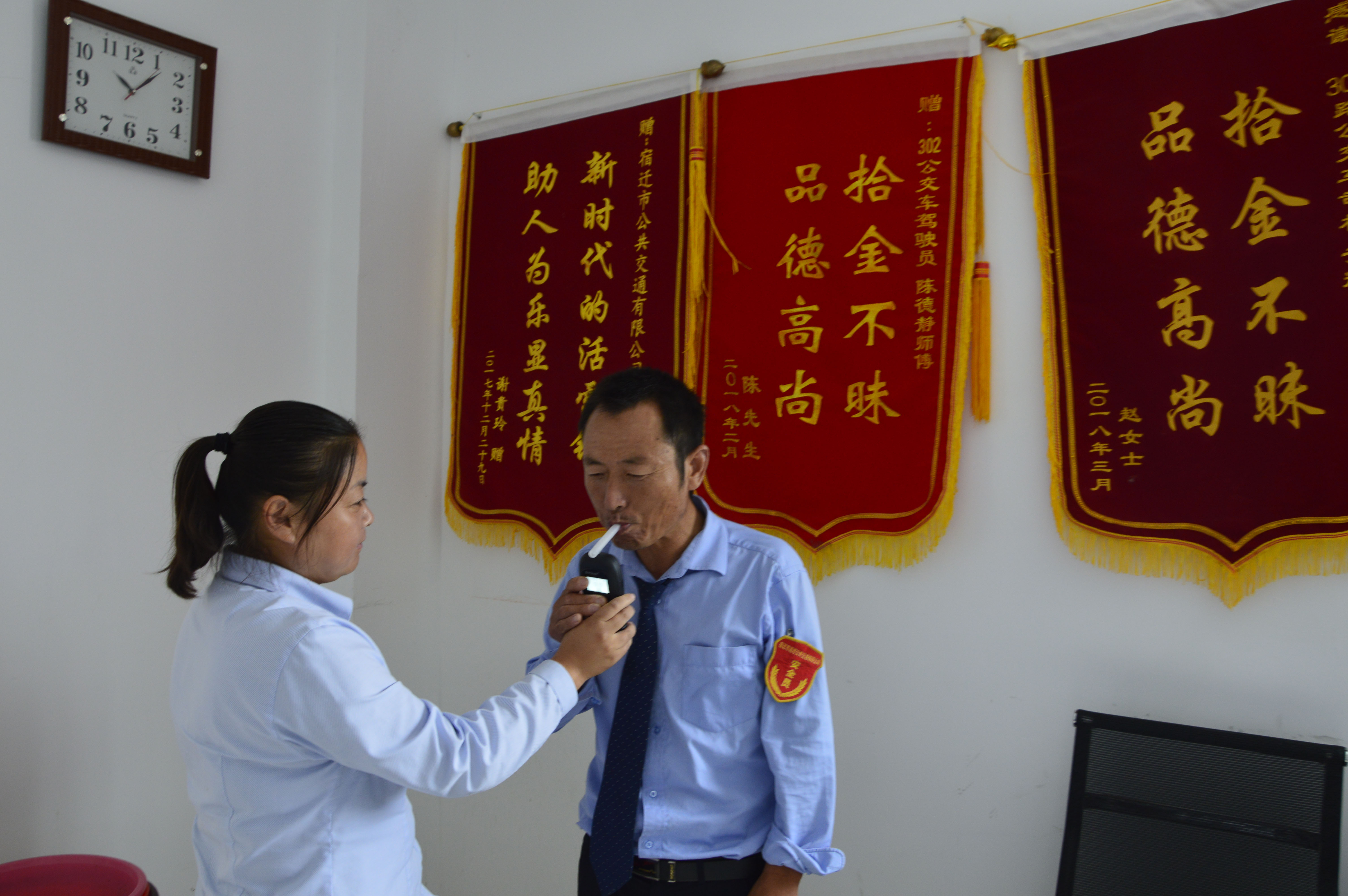 8月24日早上,在公交調(diào)度中心調(diào)度站內(nèi),站務(wù)員對(duì)即將發(fā)車(chē)的駕駛員進(jìn)行酒精測(cè)試的例行檢查,若查出不合格的將停止上線營(yíng)運(yùn)。